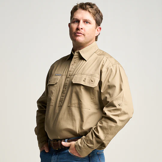 OBCMWS001-Khaki KILCOY | Mens Half Button Long Sleeve Work Shirt - Khaki